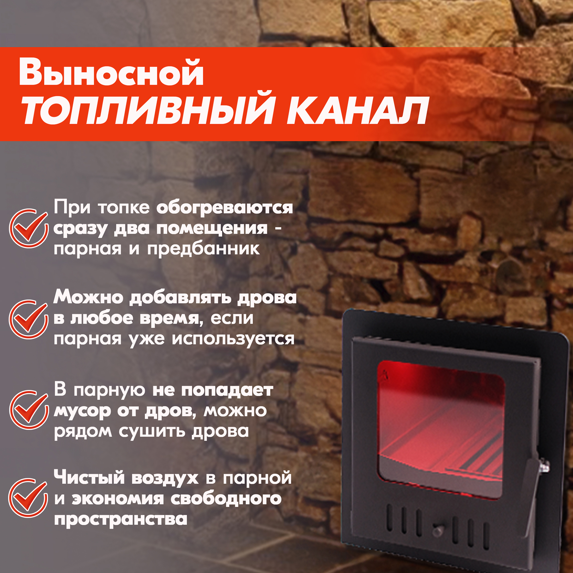 Печка для бани на дровах НМК Сибирь Камчатка оснащена выносным топливным каналом (ВТК) и может устанавливаться двумя способами: дверца топочной камеры выносится в соседствующее с парилкой помещение или вся конструкция размещается в помещении парной.