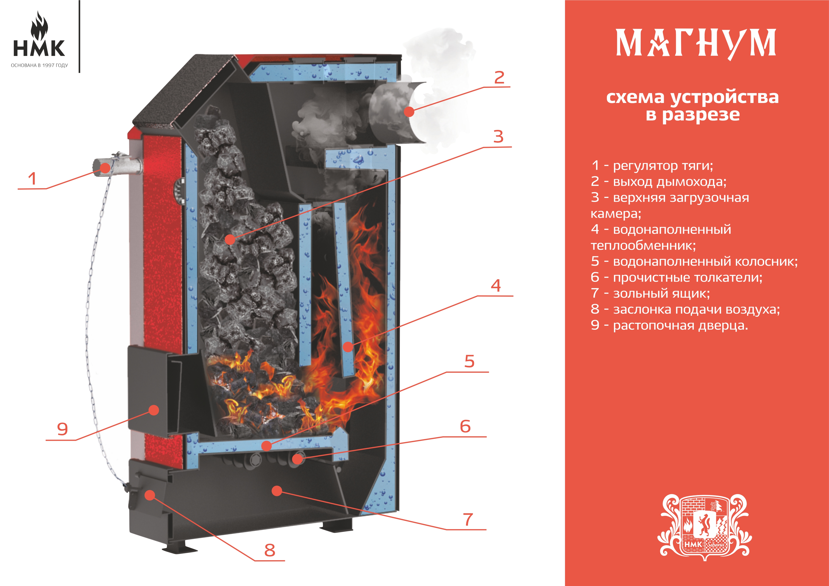 Принцип действия котла "Магнум" 20 кВт основан на передаче тепловой энергии, высвобождаемой при сжигании топлива теплоносителю - воде. В результате горения стенки, крышка и частично дно топки и поверхности труб нагреваются и передают тепло воде, циркулирующей в водяной рубашке и теплообменниках, которая выходит через патрубок подачи в верхней части котла. Вода-обратка попадает в котел через патрубок обратки в нижней части боковой стенки.